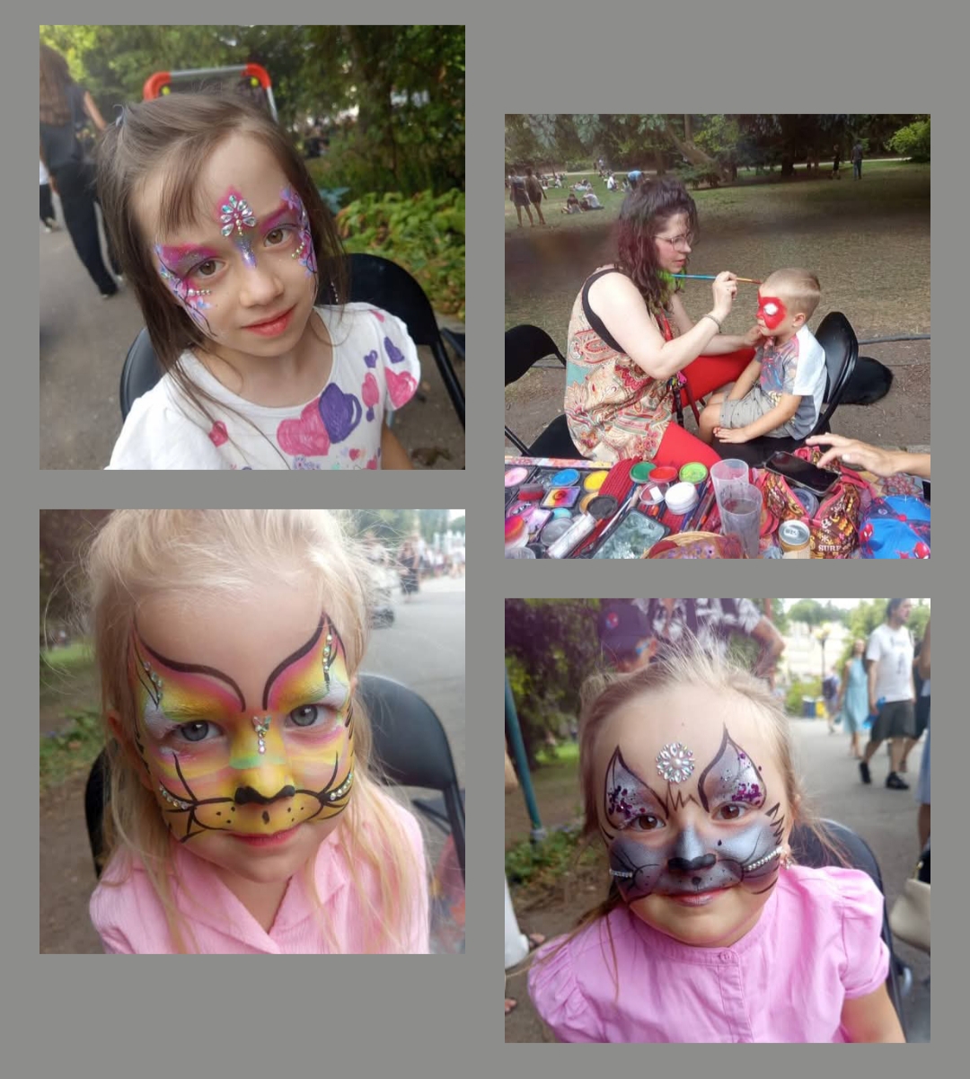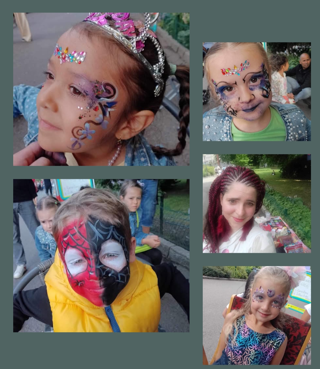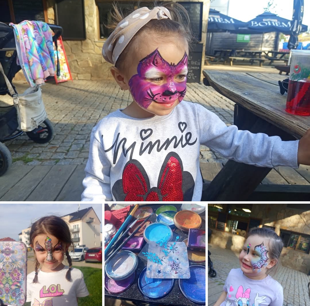 Malujeme na dětských oslavách, festivalech i různých veřejných akcích — pro školní zařízení i mimo ně. Je to hravé zpestření programu, které dětem přináší radost a dává jim možnost stát se na chvíli tím, čím chtějí být.